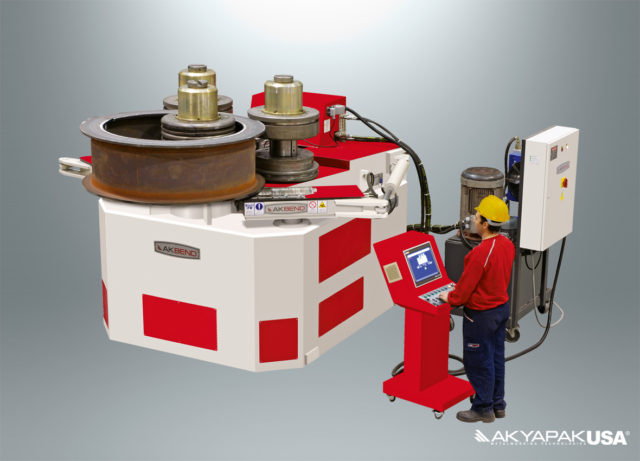 Akyapak Heavy Series Angle Rolls are 3 rolls driven. This minimizes the slip of materials during the bending process. It is accomplished by using three independent motors in parrallel circuitry. This allows the outer rolls to turn at higher RPM than the inner roll as the piece part gets tighter. The NC and CNC options keep up with the outer rolls, the feed length, and all six movements of the lateral guides.