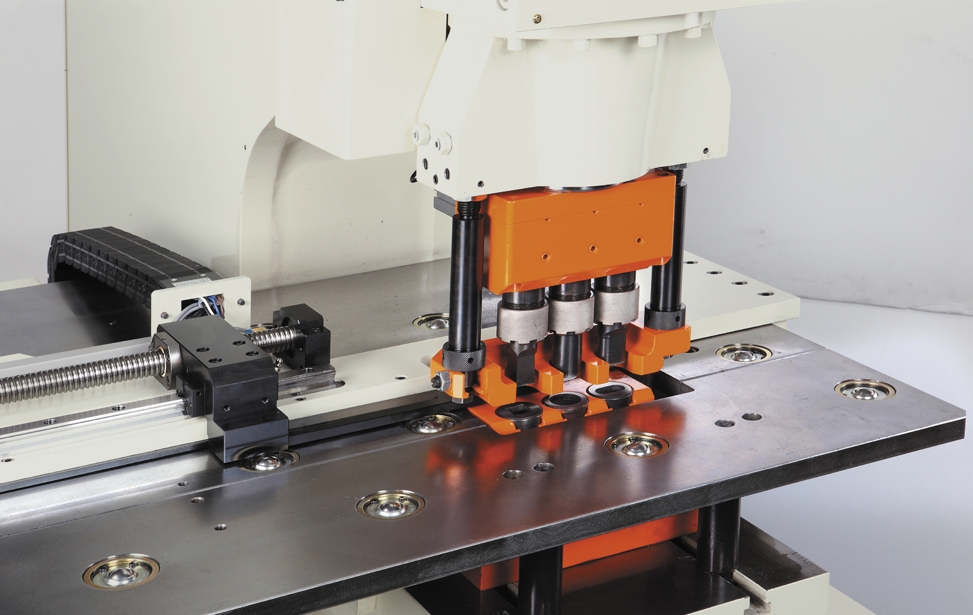 The Sunrise CNC Plate Punching semi-automatic CNC positioning tables from SUNRISE are plate, angle and channel positioning systems with simple user-friendly interfaces. The CNC positioning table is available as a factory-installed option on any Dual-Cylinder Ironworker or Punching Machine with a 510mm or larger throat depth. The operation is CNC controlled using a pendant mounted controller featuring easy programming and a virtually indestructible design. The operator simply positions the plate against the CNC-controlled X and Y stops and initiates the punch sequence. Ideal for base plates, connection plates, angles, channels and more.