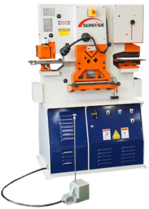 The Sunrise Dual-Cylinder Ironworker Machines range in capacity from 66 Tons to 185 Tons and feature high-speed cylinders with two-position foot pedals allowing two operators to work simultaneously. The robust dual-cylinder machine is the workhorse of the Sunrise line-up. Standard features include structural die-block, 5 independent stations, 2″ punch capacity, integrated structural steel shear and many more.
